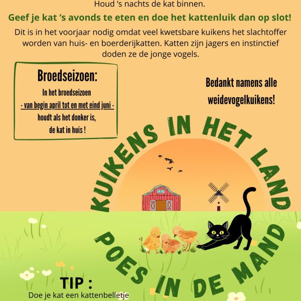 Wij zijn een actie gestart om de predatie op de weidevogelkuikens door katten te beperken. Wij roepen mensen op om de kat in het broedseizoen